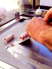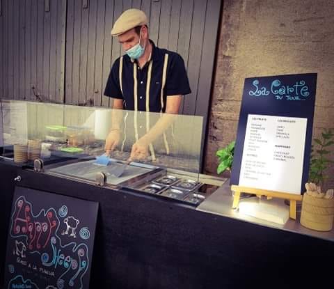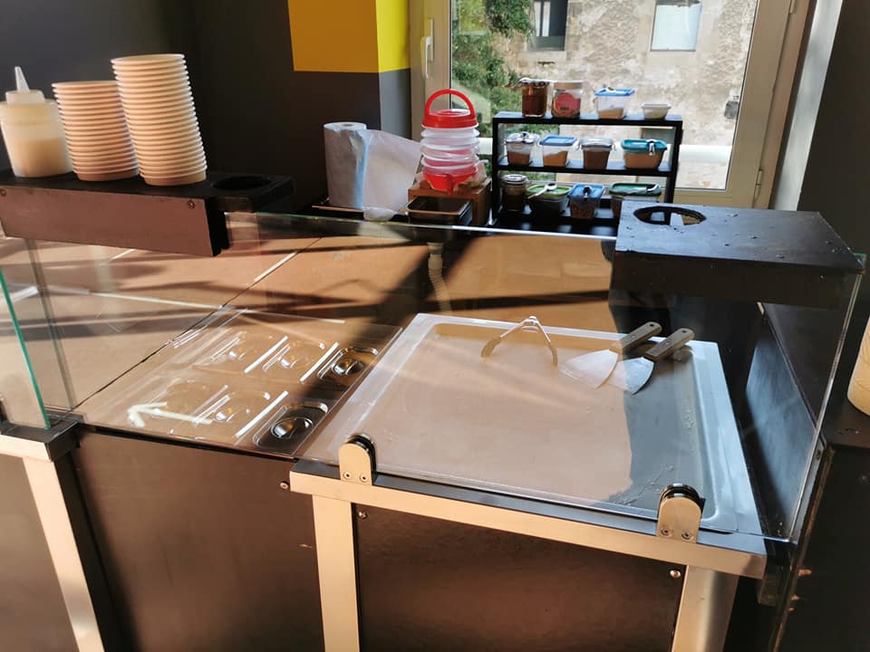 Voici une manière innovante de fabriquer des glaces à partir de produits frais sur une plancha à – 25 °C. Réalisées sous vos yeux en quelques minutes, et avec les ingrédients de votre choix, ces glaces seront une découverte aussi bien visuelle que gustative. Leur recette est une base au lait, à laquelle il vous est possible d’ajouter 1, 2 ou 3 ingrédients au choix.
